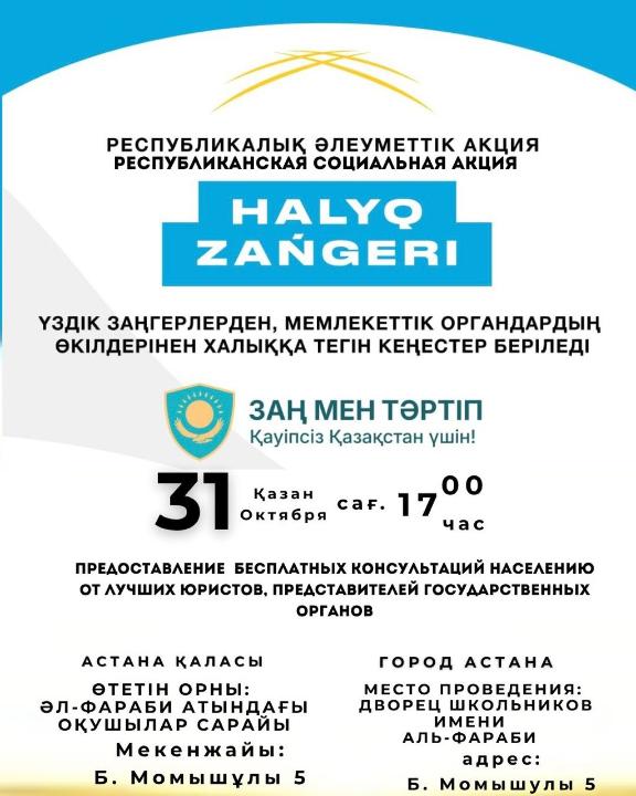 Официальный сайт акимата Астаны сообщает о проведении социальной акции «Народный юрист» 31 октября в столичном Дворце школьников имени аль-Фараби.