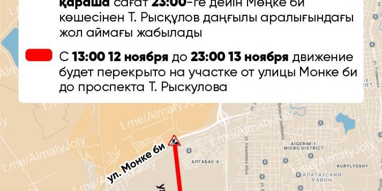 Так, 13:00 12 ноября до 23:00 13 ноября движение будет перекрыто на участке от улицы Монке би до проспекта Т. Рыскулова.