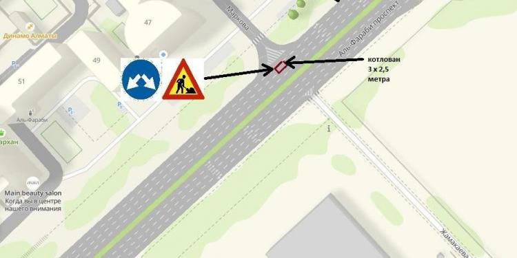 В связи с выполнением необходимых работ на участке пр. аль-Фараби в районе пересечения с ул. Маркова будет временно перекрыта одна полоса движения. Ограничение будет действовать с 21:00 15 ноября до 12:00 16 ноября 2025 года.