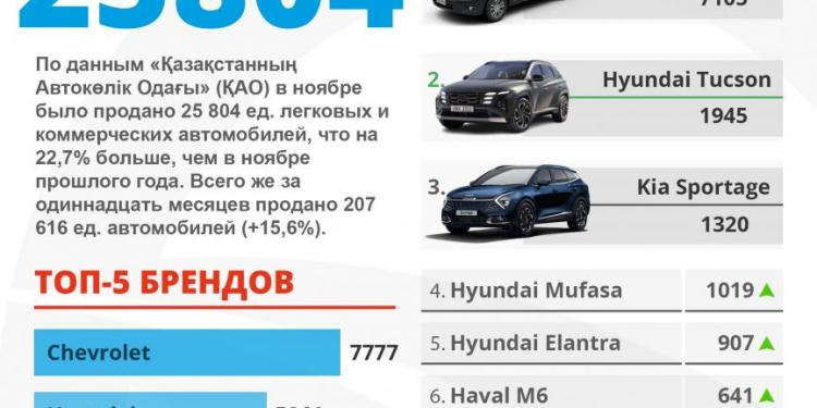 По данным «Қазақстанның Автокөлік Одағы» (ҚАО) в ноябре 2025 года в Казахстане было продано 25 804 ед.легковых автомобилей и коммерческой техники, что на 22,7% больше, чем в ноябре прошлого года. Это рекордный показатель месячных продаж, а сам 2025 год станет самым результативным за всю историю официального авторитейла в РК. Всего за 11 месяцев 2025 года казахстанскими дилерами реализовано 207 616 новых авто (+15,6%).