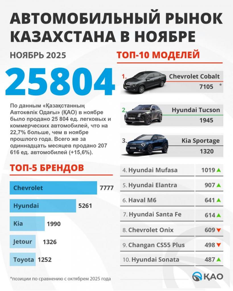 В Топ-10 самых популярных моделей в ноябре Chevrolet Cobalt (7 105 ед.), Hyundai Tucson (1 945 ед.) и Kia Sportage (1 320 ед.). Четвертое место у Hyundai Mufasa (1 019 ед.).Далее по списку: Hyundai Elantra (907 ед.), Haval M6 (641 ед.), Hyundai Santa Fe (614 ед.), Chevrolet Onix (609 ед.), Changan CS55 Plus (498 ед.) и Hyundai Sonata (487 ед.). Все автомобили в десятке, произведены в Казахстане.