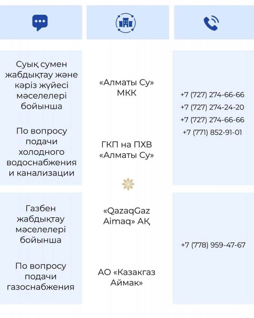 АО «Алатау Жарық Компаниясы» (электроснабжение): +7 (727) 356-99-99, +7 (701) 410-88-56;