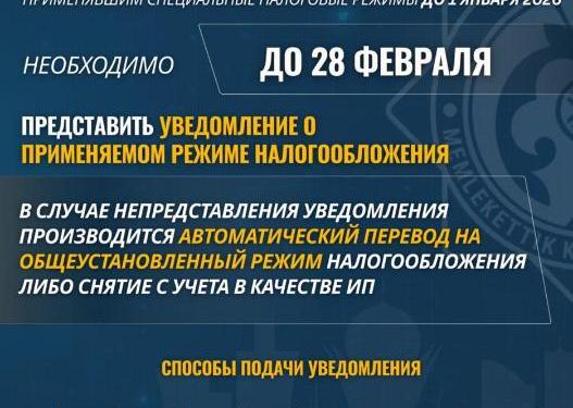 Официальный сайт акимата Астаны предупредил предпринимателей по вопросу, связанному с налогами: индивидуальным предпринимателям и юридическим лицам, применявшим специальные налоговые режимы до 1 января 2026 года, необходимо в срок до 28 февраля представить уведомление о применяемом режиме налогообложения.