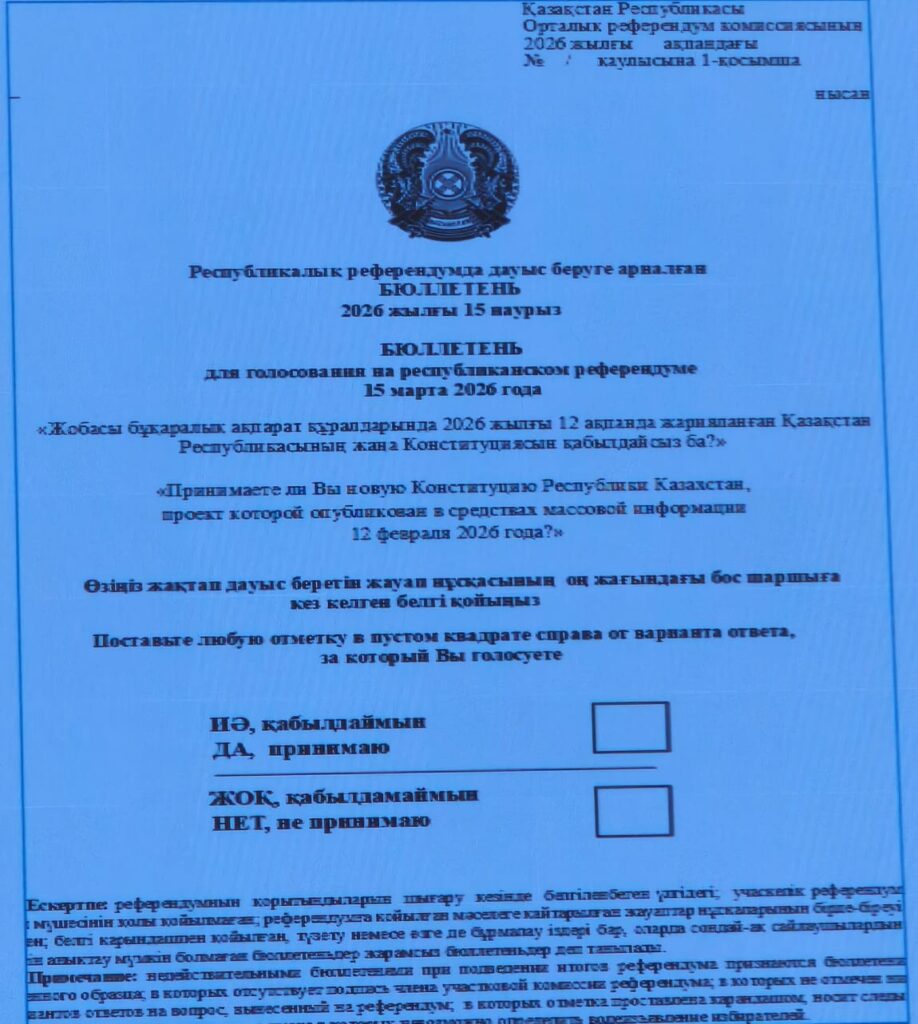 На втором заседании ЦИК показали макет бюллетеня, предназначенный для голосования на республиканском референдуме по новой Конституции Казахстана 15 марта 2026 года. Был представлен образец, выполненный с использованием шрифта Брайля для избирателей с нарушением зрения, а также образец бюллетеня, выполненный в стандартном формате, где текст продублирован на казахском и русском языках.