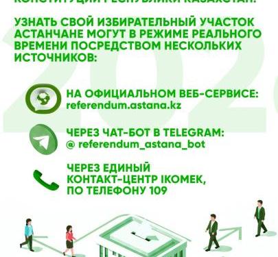 15 марта 2026 года состоится республиканский референдум по проекту новой Конституции Республики Казахстан. Жители Астаны могут получить информацию о своем избирательном участке сразу несколькими способами, передает официальный сайт акимата столицы.