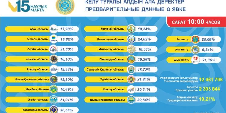 Cогласно данным, представленным территориальными комиссиями областей, городов республиканского значения и столицы, по состоянию на 10:00 часов явка граждан в регионах составила: