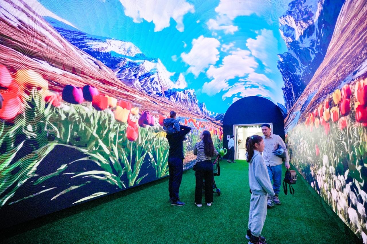 Центральная зона площадки продолжает технологическое путешествие: масштабный LED-экран с визуальным контентом, созданным искусственным интеллектом, переносит посетителей в традиционный казахский аул. Здесь ощущается весеннее обновление и уют.