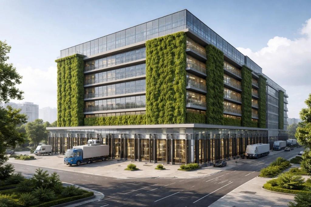 Фасад здания по всей высоте, от первого до седьмого этажа, покроет система вертикального озеленения площадью около 6 800 кв. м на основе модульных панелей с автоматическим капельным поливом. Для озеленения выбраны морозостойкие многолетники, адаптированные к климату Алматы. По расчётам проектировщиков, живой фасад снизит тепловые потери через стены на 12-15% зимой и сократит перегрев конструкций на 8-10 градусов летом.