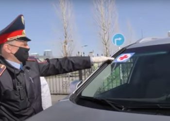 Благодаря этим наклейкам врачи смогут на личных авто беспрепятственно проезжать через мобильные посты. В Нур-Султане полицейские раздают врачам опознавательный знак...
