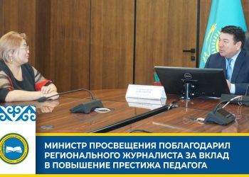 Фото: Минпросвещения Министр просвещения Гани Бейсембаев поблагодарил собственного корреспондента республиканской газеты «Литер» в Карагандинской области Самал Ахметову за вклад в...