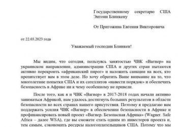 Основатель ЧВК «Вагнер», предприниматель Евгений Пригожин написал письмо госсекретарю США Энтони Блинкену. В нем он предложил американскому чиновнику профинансировать совместный...