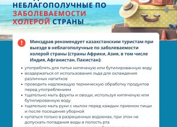 ПрочитатьDetailsФото: Мин здрав Минздрав рекомендует казахстанским туристам при выезде в неблагополучные по заболеваемости холерой страны (страны Африки, Азия, в том...
