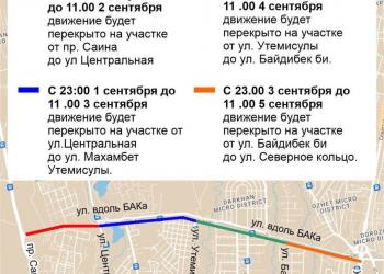 ПрочитатьDetails1 С 08:00 31 августа до 19:00 2 сентября движение автотранспорта в Алмалинском районе Алматы будет закрыто по улице Есентайской ...